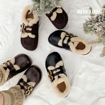 現貨 現貨 保暖圓頭內增高皮帶扣毛毛加絨單鞋